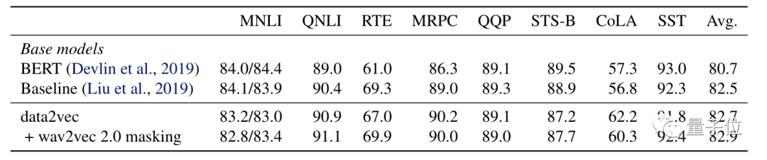 在GLUE评估中,Data2vec在自然语言推理(MNLI、QNLI、RTE),句子相似性(MRPC、QQP、STS-B),语法(CoLA)和情绪分析(SST)等指标中和RoBERTa不相上下。