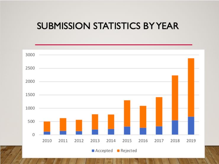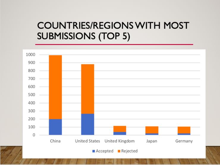 从投稿国家看,中国的已经排名第一,但录用数量差不多少了70篇。