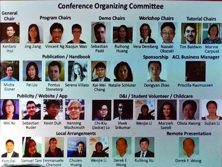 程序委员会三名华人主席 Jing Jiang、Vincent Ng、Xiaojun Wan(万小军)介绍了会议相关信息。