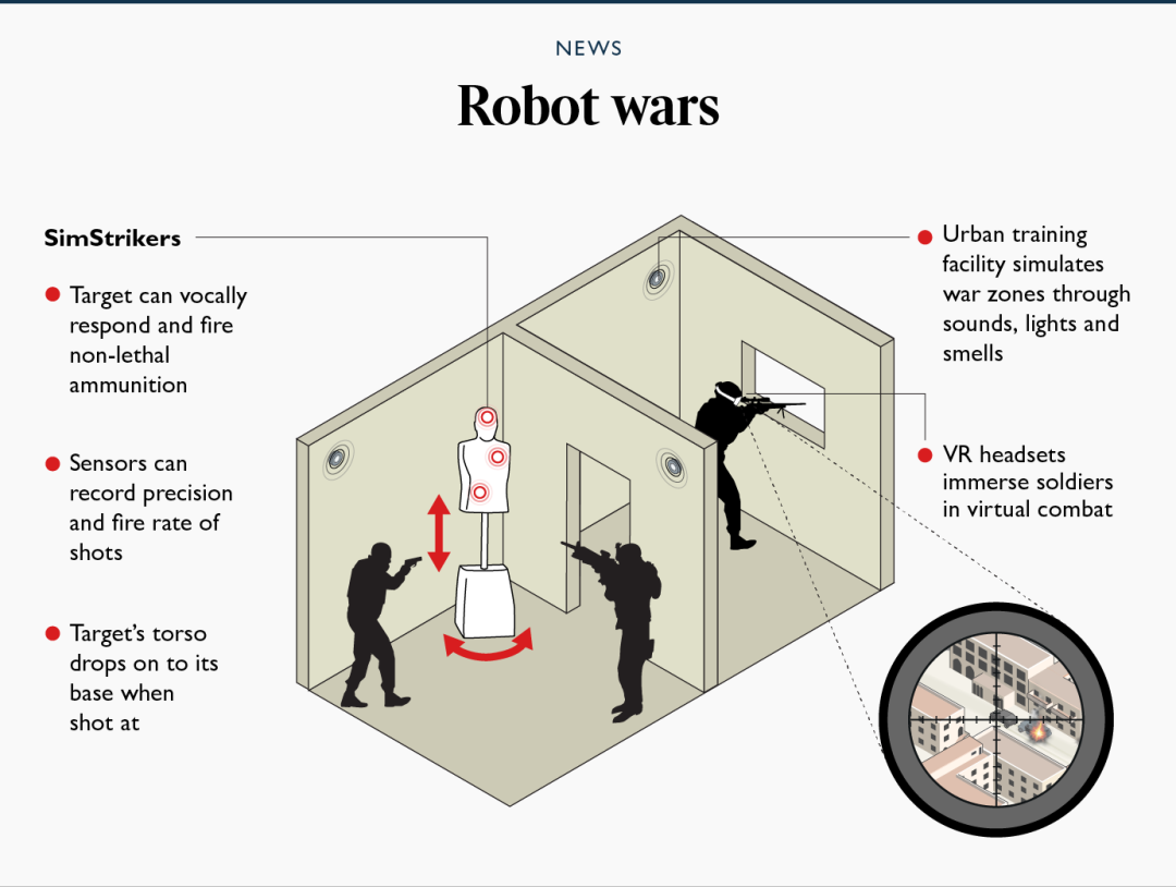 这些机器人士兵也不是吃素的。他们都装备有BB枪式弹丸,可以向部队开火,还能在精英部队进入建筑物时旋转着面对他们。这些BB枪式弹丸会从人形机器人的头部和臀部发射,人体模型上的传感器还可以记录受训者在训练场景中的射速和准确性。