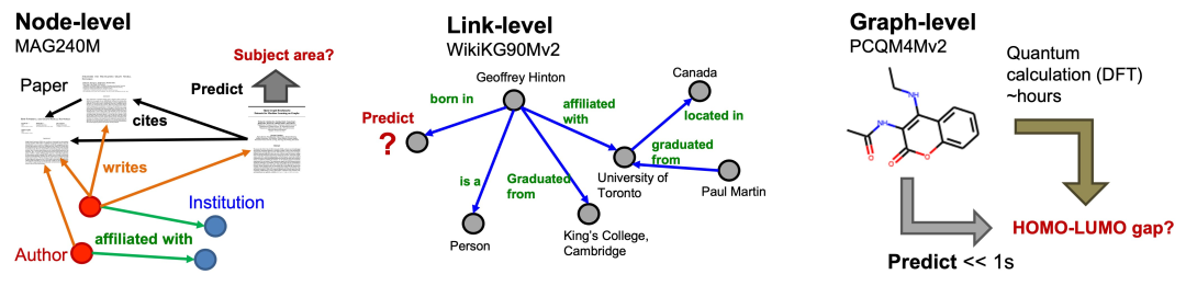 OGB-LSC 2022 提供了三个规模空前的图数据集,分别涵盖了节点、链接和整图级别的预测任务。下面提供了三个 OGB-LSC 图数据集的说明性概述。