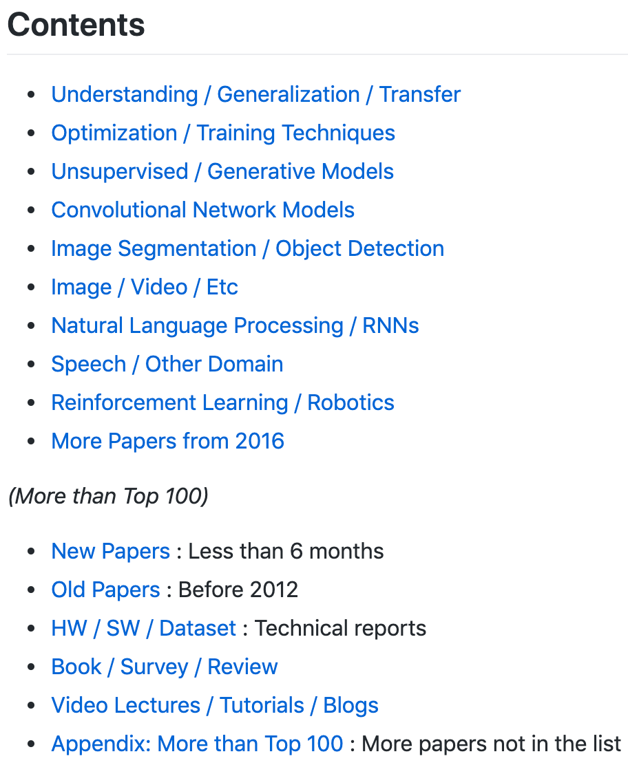 在 GitHub 上有一个关于深度学习论文阅读路线图的存储库,包含了 100 篇 Top 深度学习论文,涉及自然语言处理、机器人、语义图像分割等多个领域,为初入深度学习的研究者提供引导方向。