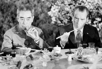 周恩来在上海设宴款待美国总统,尼克松用筷子就餐。