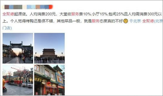 这样一来,大厅10%的服务费就差不多人均30元,只是这服务也并没有比那些免费的强到哪里去。在美团点评上,北京大部分全聚德门店的评价只达到了3.8分,消费者的评价普遍都是“味道一般、售价过高”“极其失望,服务太差,不值一尝”。