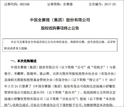 但不久之后,全聚德发布收购终止通知,称由于交易的复杂性以及推进的不确定性,本次收购不能在自意向书签署之日起150日内完成正式收购协议的签署。