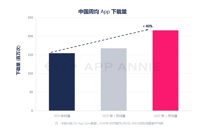 36氪获悉,App Annie发布的最新报告显示,在2020年2月的前两周,中国大陆iOS市场的平均每周应用总下载量比2019年全年的周平均值增加了40%。在2020年2月,游戏类应用下载次数最多,随后是教育,工具,娱乐和照片与视频类别。就增长而言,教育和商业类别的周下载量增长最快,约为2019年每周平均量的两倍。
