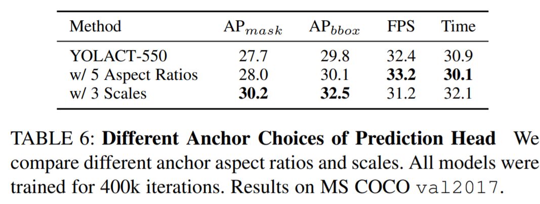 作者尝试两种变体:(1)保持尺度不变,同时将anchor长宽比从[1,1 / 2,2]增加到[1,1 / 2,2,1 / 3、3],以及(2)保持 长宽比不变,同时将每个FPN level 的比例增加三倍([1x,2^(1/3)x,2^(2/3) x])。与YOLACT的原始配置相比,前者和后者分别增加了5/3倍和3倍的 anchors 数量
