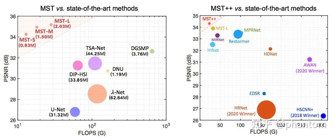 ▲ 图1 MST 与 MST++ 与 SOTA 算法的对比图。横轴代表计算量,纵轴代表性能,圆半径代表参数量。