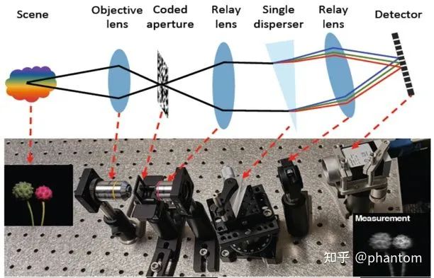 那么既然高光谱图像那么有用,我们应该如何获取它呢?传统的成像设备采用光谱仪对成像场景进行空间域通道维度的扫描,费时费力,不适用于运动场景。近些年,科学家们专门设计了快照压缩成像(Snapshot Compressive Imaging,SCI)系统来解决这一问题。在诸多 SCI 系统当中,编码孔径快照光谱成像(Coded Aperture Snapshot Spectral Imaging)系统脱颖而出,成为捕获获取光谱图像的重要手段,其结构如图 2 所示