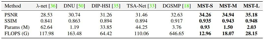 先验货,MST 与 MST++ 与 SOTA 方法对比如图 1 所示,很轴为计算量,纵轴为性能,圆半径代表参数量。MST 与 MST++ 占据了左上角,参数量也非常小,实现多快好省的高光谱图像重建。