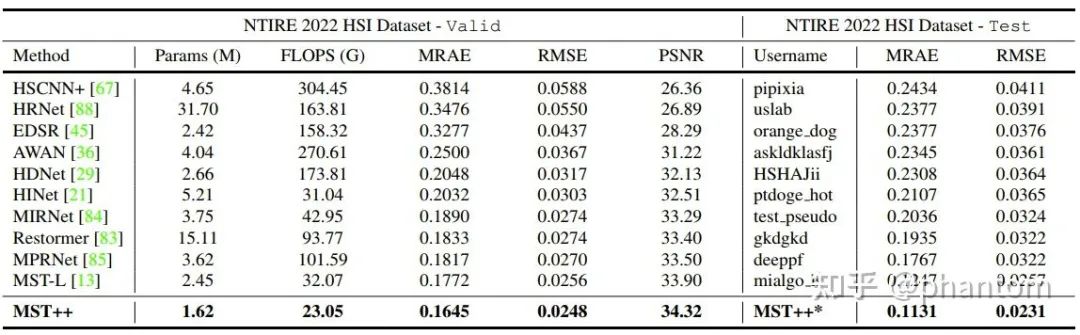 ▲ 表3 MST++与SOTA方法在NTIRE 2022的validation和test数据集上的性能对比