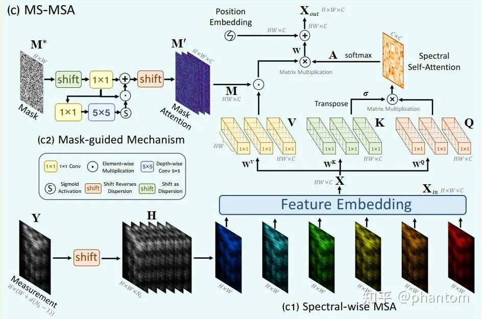 其中的 MS-MSA 又可以拆解为两部分,即 Mask-guided Mechanism(MM)和 Spectral-wise Multi-head Sefl-Attention(S-MSA)。为了避免大家觉得枯燥无味,这里就不给大家看比较琐屑的公式了。下面我会用语言大概介绍一下,相关细节请参照原文。MS-MSA 的结构如图 5 所示