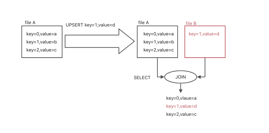这种方式没有写放大,但是在查询时需要将数据文件和对应的delta文件做join操作。