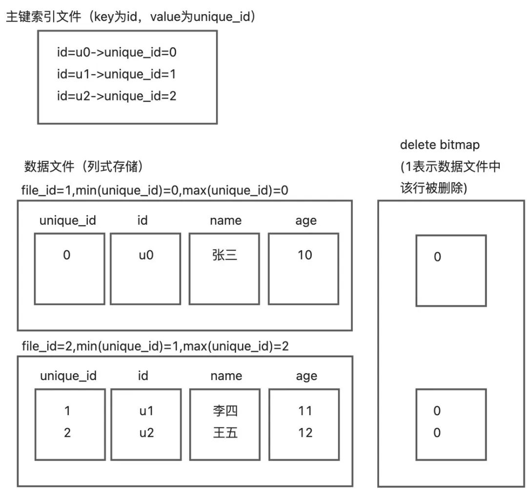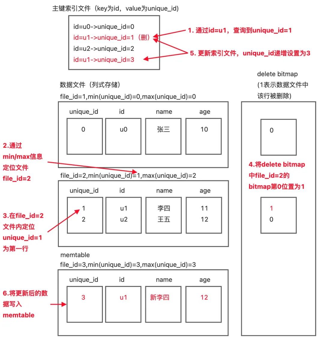 第三种是delete bitmap文件,每个file id对应一个bitmap,bitmap中第N位为1表示file id中的第N行标记为删除。delete bitmap在列存模型下,相当于是表的一列数据。Update时只刷新bitmap信息既保留了Merge on Write对查询性能几乎零破坏的优点,又极大降低了IO的开销。