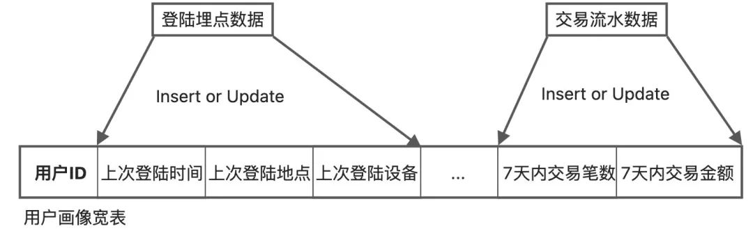 画像类应用。这类应用在实时风控、实时广告投放等非常常见。上游多个Flink Job实时计算画像的不同维度,并实时写入到同一行记录的不同字段中。