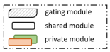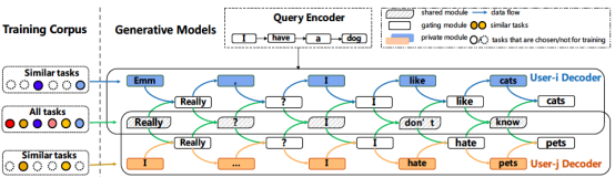 对于每个任务,相应的生成模型由三部分组成:共享模块(shared module)、私有模块(private module)和门控模块(gating module)。共享模块是一个传统的序列到序列模型(seq2seq),旨在学习一般的生成能力。此模块在任务之间共享。私有模块旨在记住任务独特的特性。所有任务的私有模块都是从seq2seq解码器中的同一个多层感知机(Multi Layer Perception, MLP)开始,然后在训练过程中演变成不同的结构。门控模块用于平衡前两个模块的贡献,并且也在任务之间共享。