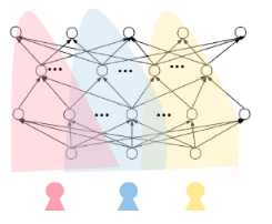 这里,私有模块是用来捕获每个任务的唯一性的,它应该仅仅使用单一任务的数据数据进行训练。然而,在低资源场景下,本文并没有足够的训练数据来训练这部分。幸运的是,所有私有模块都是从相同的MLP结构演变而来的,相似的任务自然会有重叠的网络结构,即修剪后的剩余边缘重叠,而不相似的任务没有重叠。如图所示: