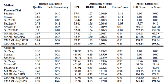 为了验证CMAML的有效性,本文在两个数据集上进行了实验:Persona-chat和Mojitalk。在Persona-chat中,本文把为用户建立对话模型看作是一项任务。在Mojitalk中,本文将使用指定的表情(emoji)生成对话回复视为一项任务。