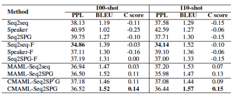本文提出的CMAML算法可以为每个任务定制一个具有独特的网络结构和参数的模型,且每个生成任务只需要一到两百个训练样本。独特的模型结构可以记住每个任务的独有特征,且相似的任务可以从模型结构的角度共享训练数据。这里,每个任务独特的模型结构可以看作是记录模型特性的记忆模块,相似的任务有可重叠的记忆单元。此外,CMAML具有良好的通用性,其定义的生成模型和训练算法对任务没有特殊要求,能够适应各种低资源下的生成场景。
