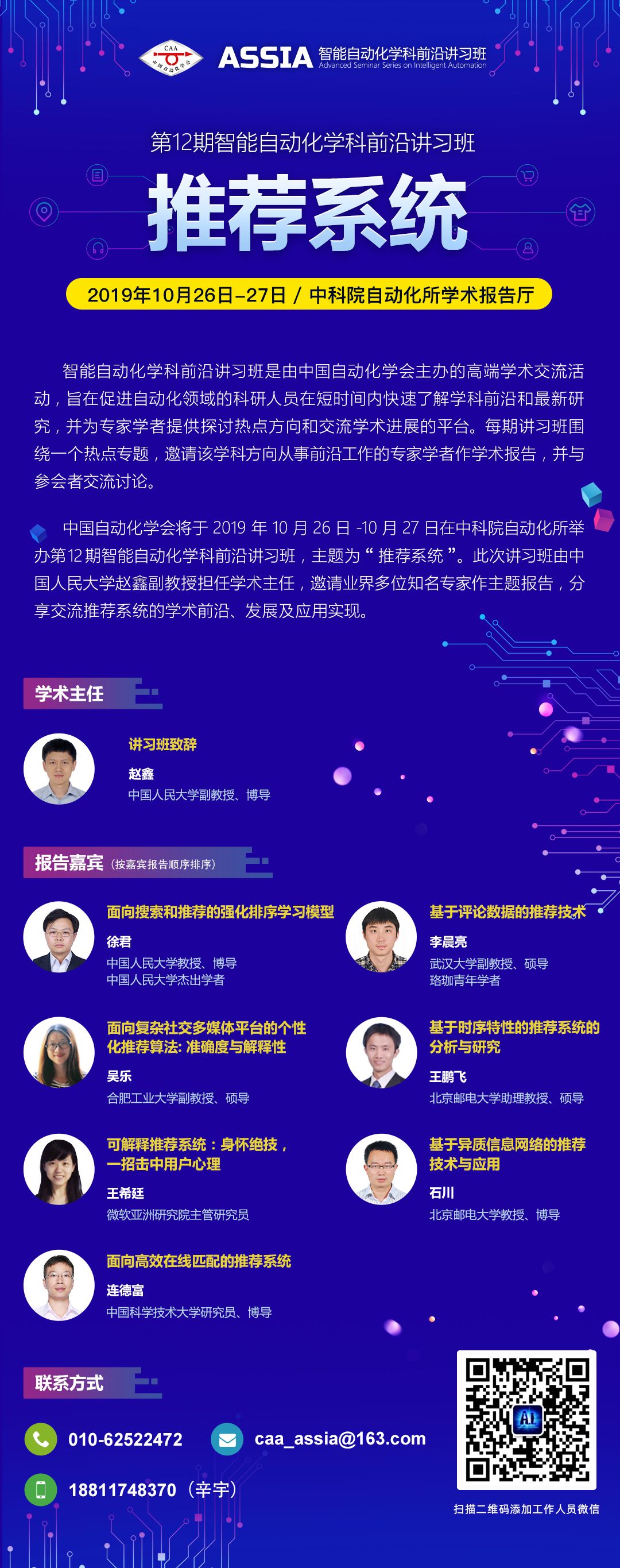 【导读】中国自动化学会将于2019年10月26日-10月27日在中国科学院自动化研究所举办第12期智能自动化学科前沿讲习班,主题为“推荐系统”。此次讲习班由中国人民大学赵鑫副教授担任学术主任,邀请业界多位知名专家作主题报告,分享交流推荐系统的学术前沿、发展及应用实现。