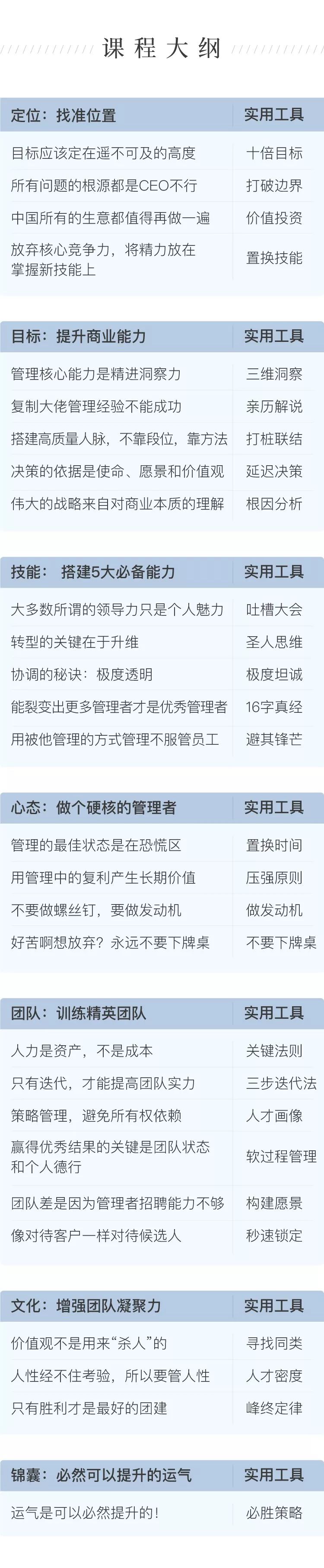 课程中姜老师将自己过去10年在硅谷及国内的管理实践经验,以及跟4000多位中国顶尖的CEO/CFO、600多位投资人交流的商业和人性的总结全盘分享给大家。