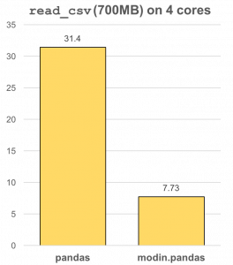 在pandas中,当你做任何类型的计算的时候你每次只能使用一个核心。但是使用Modin,你可以使用机器上的所有CPU内核。即使在read_csv中,通过有效地在整个机器上分布工作,我们也看到了巨大的成效。
