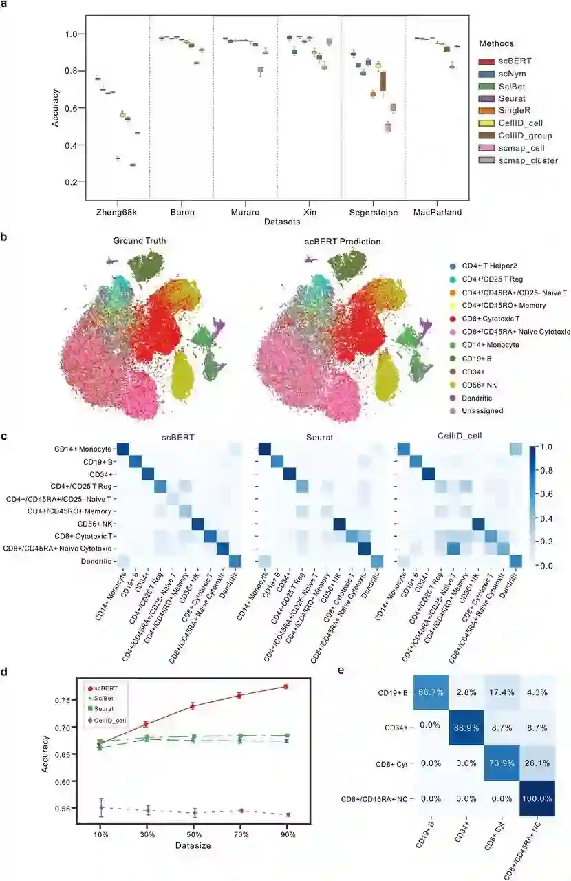 从结果上来看,scBERT 实现了高解释性、高泛化性、高稳定性的单细胞类型注释技术。截至目前,通过了 9 个独立数据集、超过 50 万个细胞、覆盖 17 种主要人体器官和主流测序技术组成的大规模 benchmarking 测试数据集上,该算法模型的优越性均得以验证。其中,在极具挑战的外周血细胞亚型细分任务上,相较现有最优方法的 70% 准确度提升了 7%。