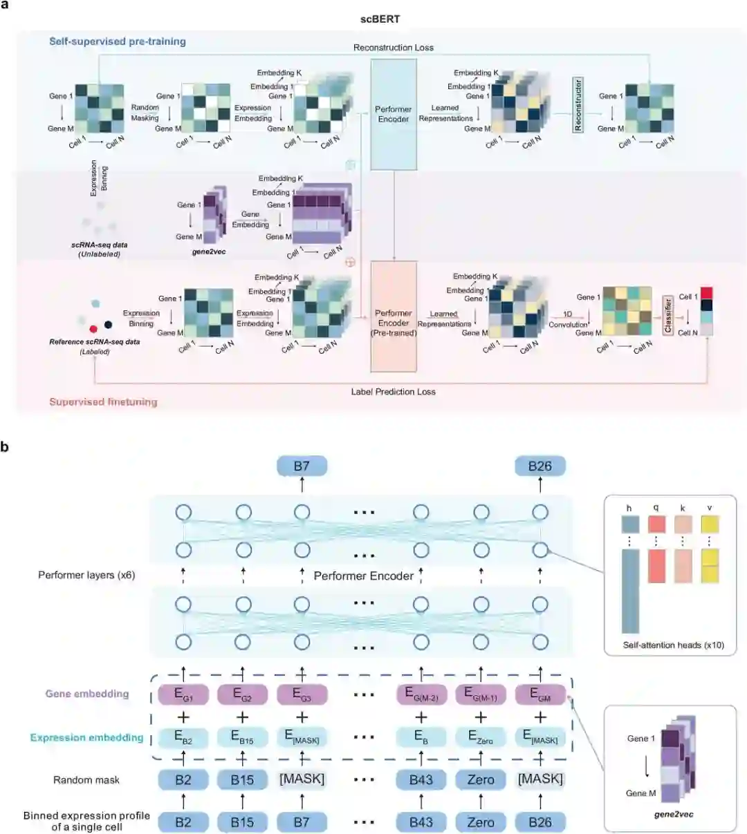 在模型中,针对单细胞测序数据特点,研究人员提出了 gene embedding 和 expression embedding,把每个单细胞表达谱特异性转化为模型的输入。在自监督预训练阶段,模型通过随机对非零表达值进行 mask,随后通过基于 Performer 的编码器编码,将输出结果与未 mask 的模型输入计算重构损失。