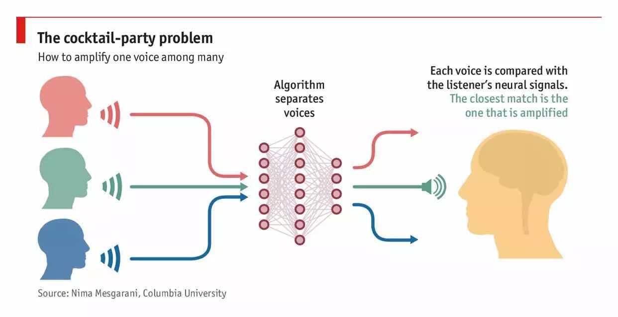 因此,大脑非常善于解决问题,电脑也是如此。例如,助听器的一个问题是它会放大所有传入的声音。当你想在像聚会那样嘈杂的环境中关注一个人时,这就提供不了什么帮助。哥伦比亚大学的 Nima Mesgarani 正在研究一种方法来区分你想要听的人。这个想法是,一种算法将区分同时说话的不同声音,创建一个声谱图,或者说是一种对每个人的说话的声音频率的可视表示。然后当助听器的佩戴者专注于一个特定的对话者时,它观察大脑中的神经活动,这个活动被创建为另一个声谱图,两个声谱图中相匹配的声音会被放大(见图)。