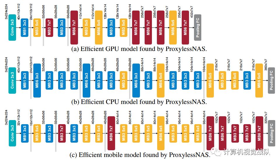 下图展示了在三个硬件平台上搜索到的CNN模型的详细结构:GPU/CPU/Mobile。