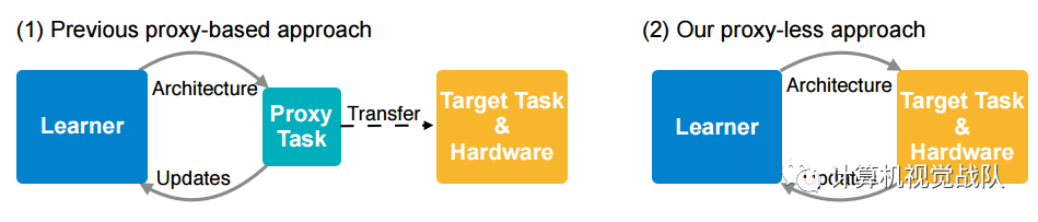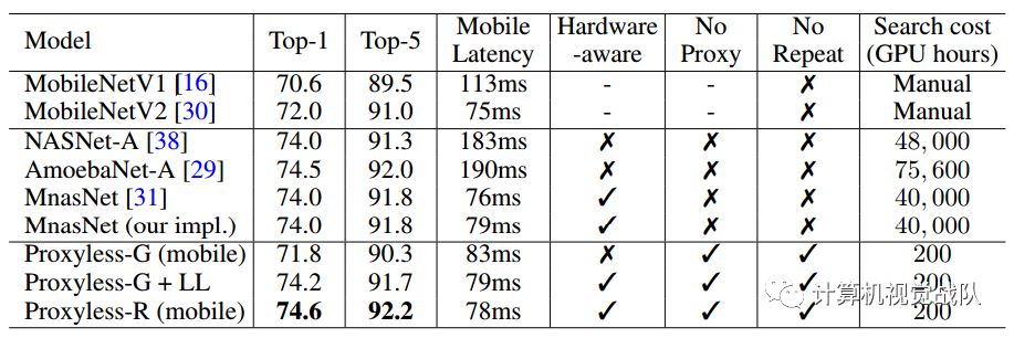 ProxylessNAS是第一个在没有任何代理的情况下直接学习大规模数据集上的CNN结构的NAS算法,同时仍然允许大的候选集并消除重复块的限制。它有效地扩大了搜索空间,实现了更好的性能;