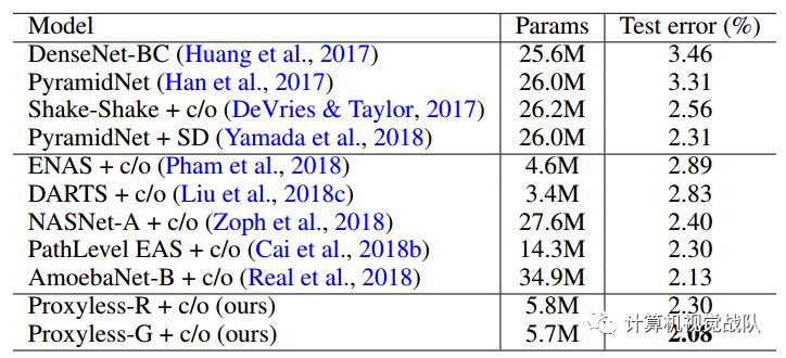 在CIFAR-10和ImageNet上进行了实验。不同于之前的NAS工作,作者直接在目标数据集上进行神经网络结构学习,为目标硬件进行优化,同时允许每一个block自由地选择操作。
