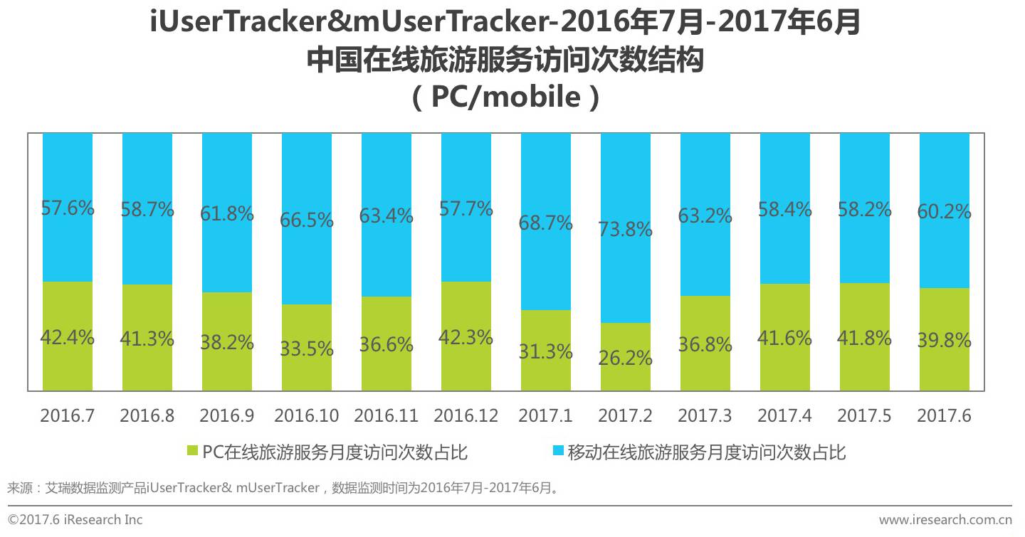 艾瑞监测数据显示,PC与Mobile端访问次数结构在Q1变化最为明显。PC端的访问次数高峰为2016年12月,随后开始下滑,3月回升。而Mobile端的访问高峰在1月,2月,随后3月开始下滑。艾瑞分析认为,受春节返乡影响,短途火车与长途飞机预订集中爆发,移动端随时刷票的便捷性更符合人们春节出行需求,因此移动端流量爆发集中在Q1。