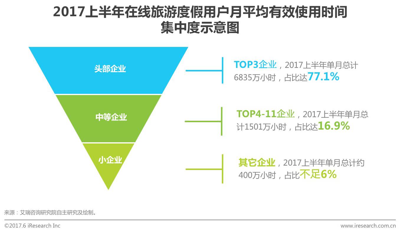 艾瑞监测数据显示,从用户使用时长占比来看,在线旅游度假行业移动端企业流量呈现倒金字塔结构,集中度进一步加强。与去年年末相比,头部企业流量占比上升1.1个百分点,至77.1%,小企业流量占比下降2个百分点,至6%,头部企业的移动端有效使用时间占比不断提升,小企业生存空间有限。