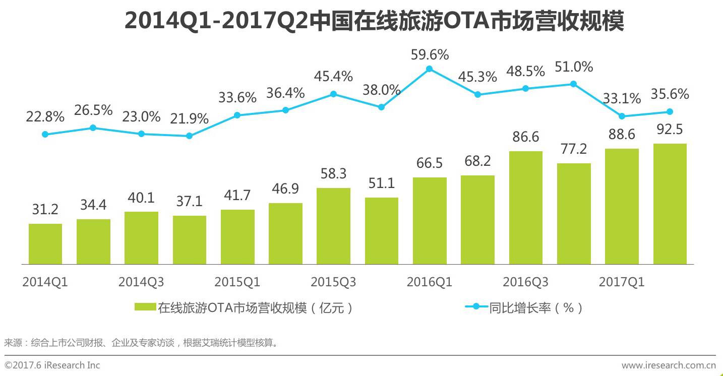 · 2017Q2在线旅游OTA营收规模92.5亿元;
