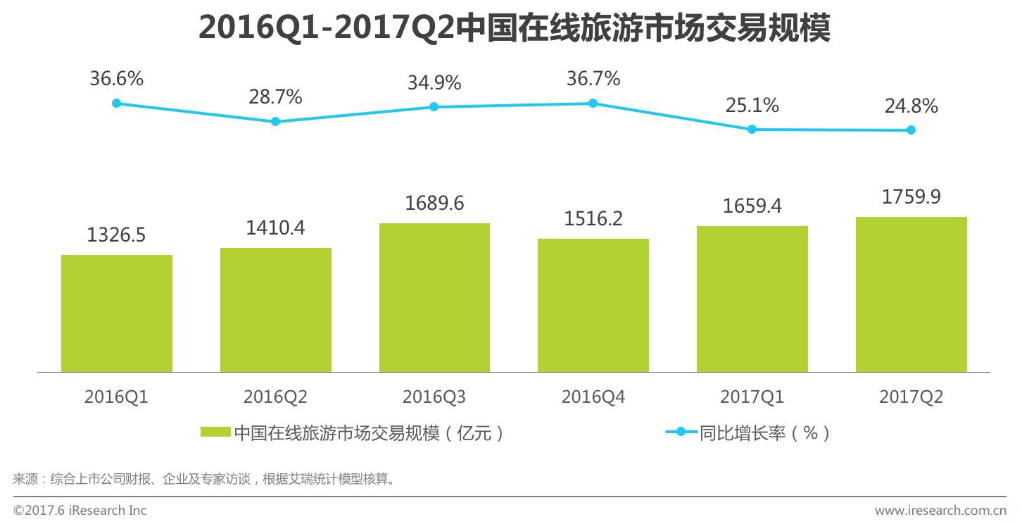 2017Q2在线旅游市场交易规模1759.9亿元,同比增长24.8%,相较2016Q2下降3.9个百分点。艾瑞咨询认为,随着互联网人口红利逐步消失,线上的获客成本不断提升,行业巨头纷纷在线下开设门店,线上市场交易规模将受到影响,增长逐步放缓。