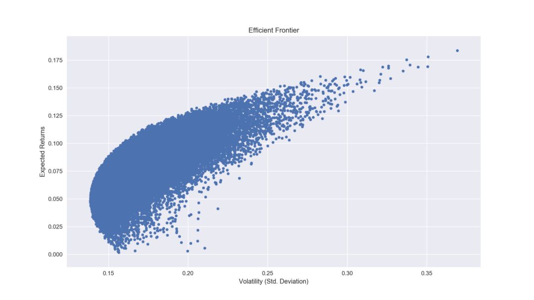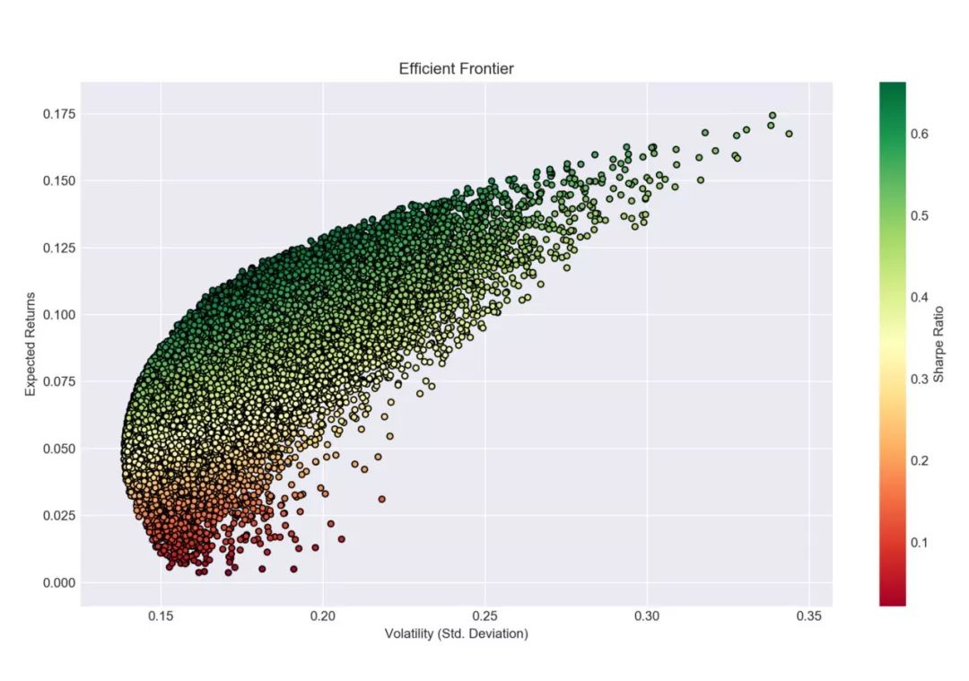棒极了!繁琐的步骤现在都已经完成了!我们来看一下有效前沿长什么样: