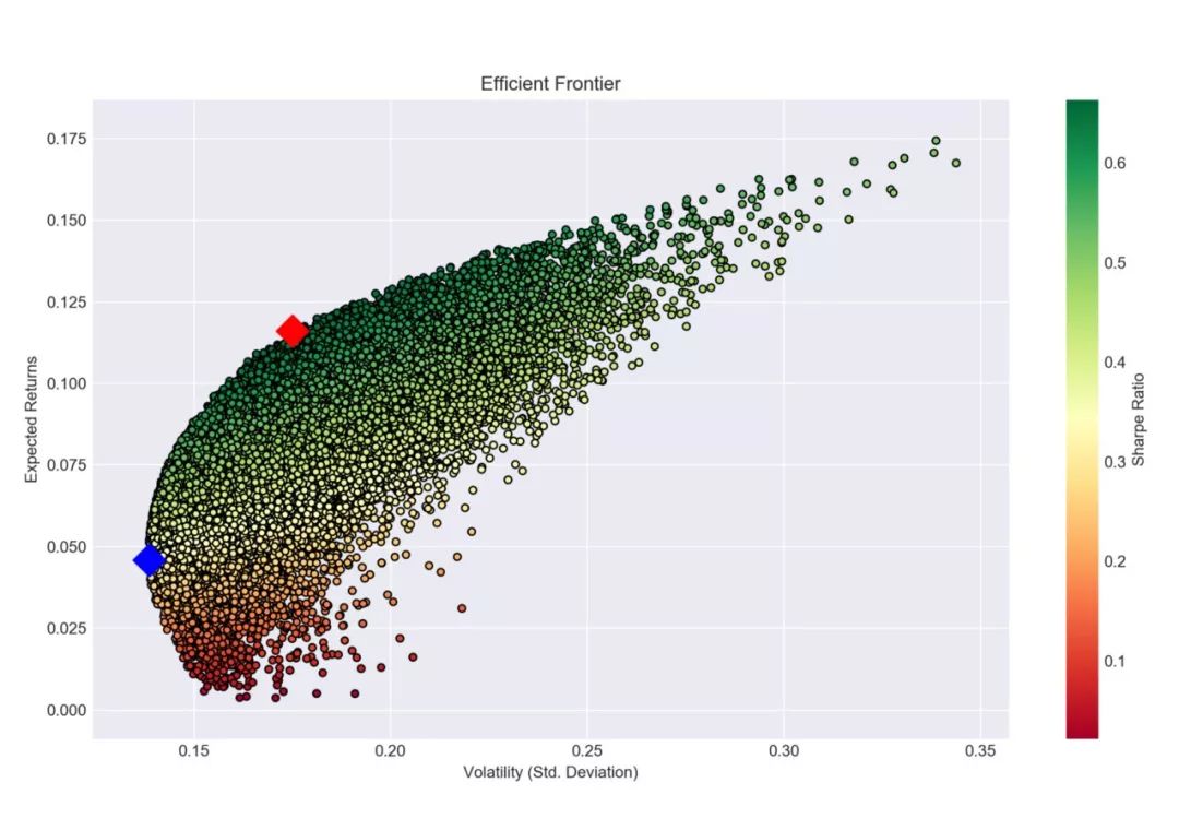 风险厌恶最严重的投资者将会选择最小方差组合,它的期望收益率是4.58%,期望波动率是13.86%。追求最大风险调整收益率的投资者将会构建有着最大夏普比率的投资组合,它的期望收益率是11.61%,期望波动率是17.50%。