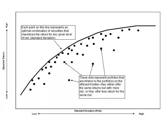 这一理论最基本的原则是投资者可以构建投资组合的有效集合,即有效前沿。有效前沿可以在特定风险水平下使期望收益最大化。投资者对风险的容忍度将决定他所选择的有效前沿。低容忍度的投资者会选在最低风险下可以提供最大收益的组合,高容忍度的会选择高风险下的可以提供最大收益的组合。可以从下图大致理解有效前沿的概念: