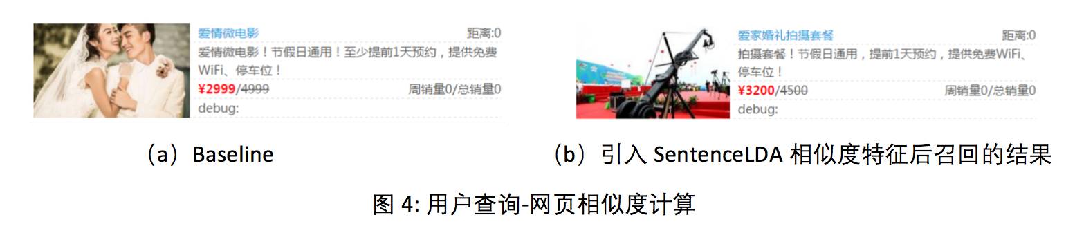 在线广告场景中,需要计算用户查询和广告页面的语义相似度。这时可应用 SentenceLDA,将广告页面中各个域的文本视为句子,如图 3 所示(红框内容为句子)。首先通过主题模型学习得到广告的主题分布,再使用公式 (1) 计算用户查询和广告页面的语义相似度。该相似度可以作为一维特征,应用在更复杂的排序模型中。在图 4 中,对于 query=“婚庆拍摄”,研发团队对比了不同特征组合的结果。其中左图为 Baseline,右图则是引入 SentenceLDA 相似度(基于 SentenceLDA 计算 query 与广告页面的相似度)后得到的结果。可以看出,相比于 Baseline,引入新特征后召回的结果更加符合 query 语义,能更好的满足用户需求。