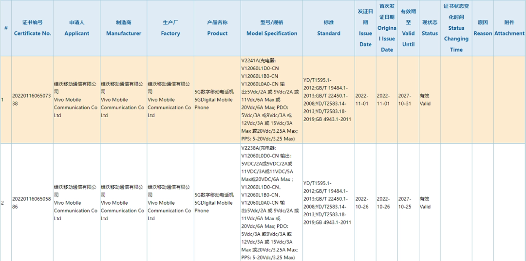 vivo 现有一款型号为 V2241A 的新机通过了国家 3C 质量认证,显示该机支持 120W 快充。有数码博主指出,如果 V2242A 确认是 vivo X90 Pro 骁龙版的话,那这 V2241A 极有可能是 vivo X90 Pro 的天玑版,有望首发新一代联发科天玑 9200 旗舰平台。此外,@熊猫很秃然 表示,除 V2227A(疑似 X90 Pro+)依然是 80W 快充外,X90 和 X90 Pro 均为 120W 快充。