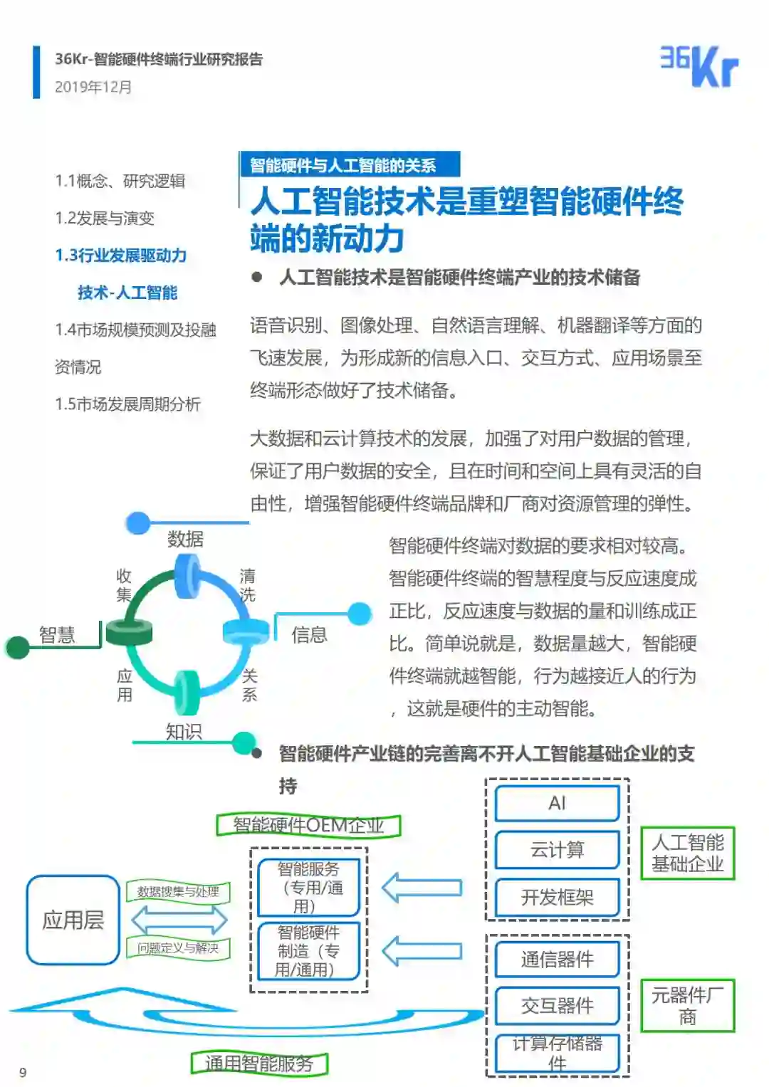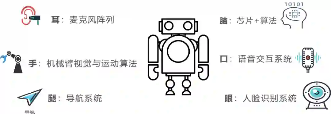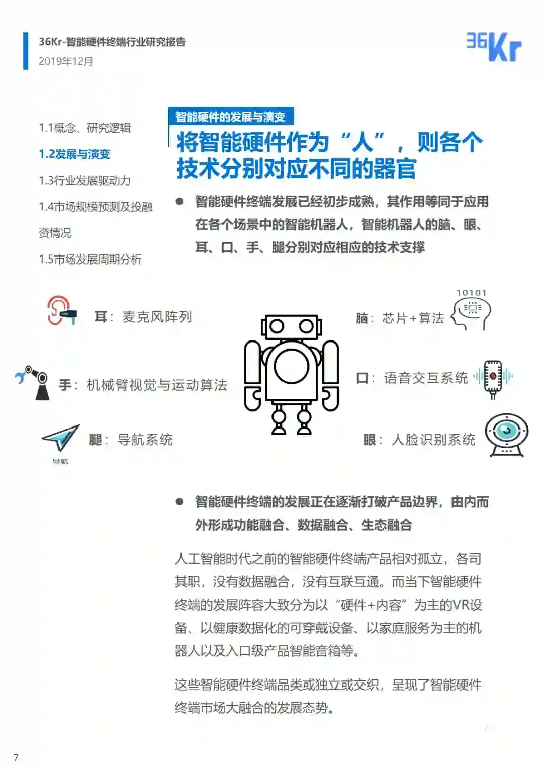 “智能时代”的特征就是世界是个物物相连的互联网,智能硬件终端等同于应用在各个场景中的智能机器人,智能机器人的脑、眼、耳、口、手、腿分别对应相应的技术支撑,且智能硬件终端的发展正在逐渐打破产品边界,由内而外形成功能融合、数据融合、生态融合。