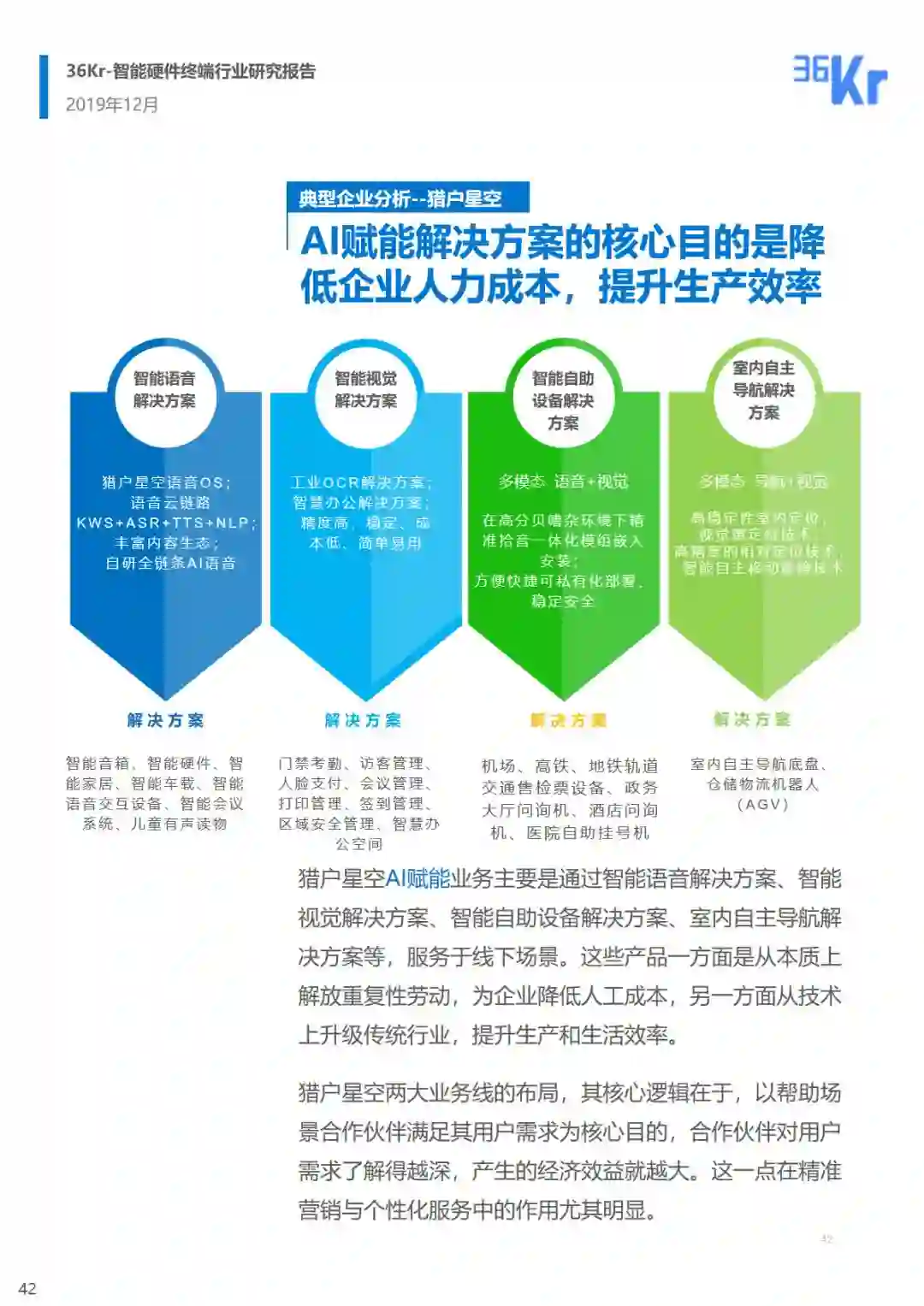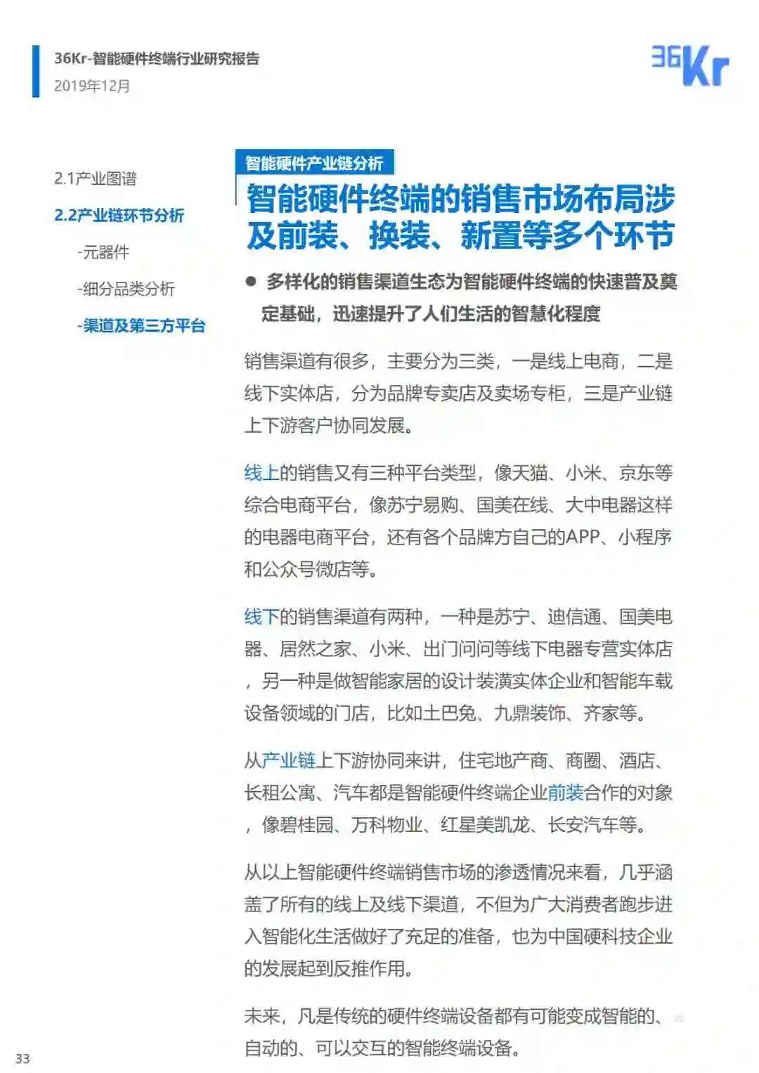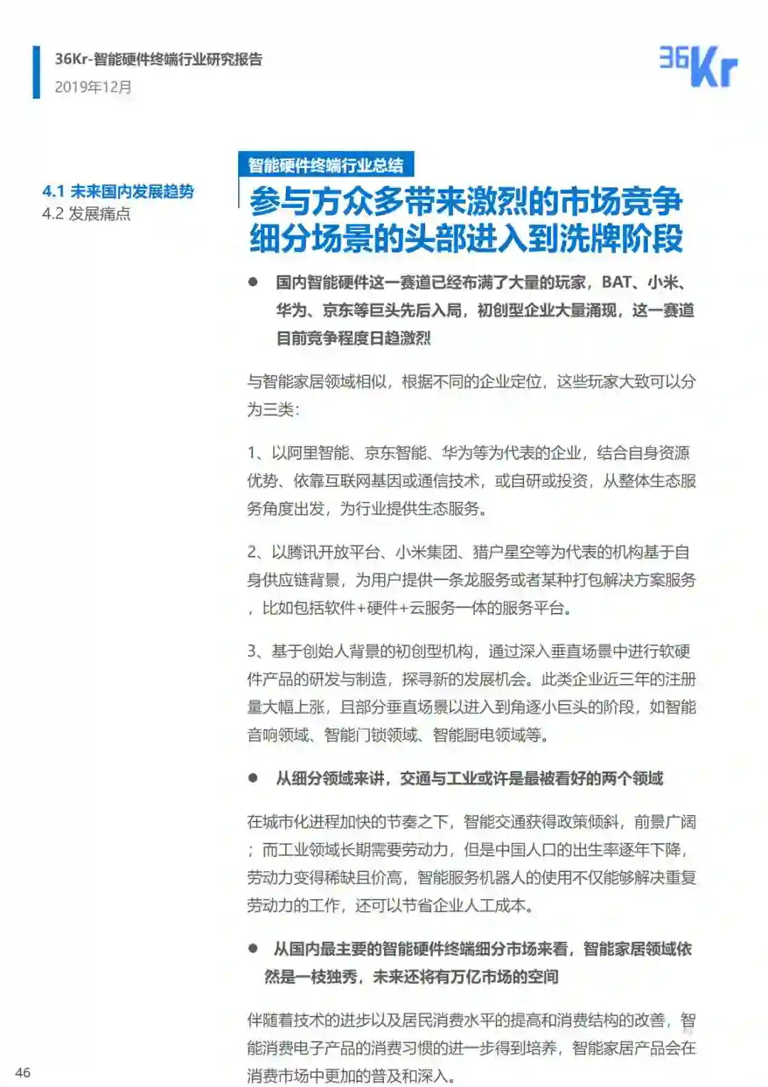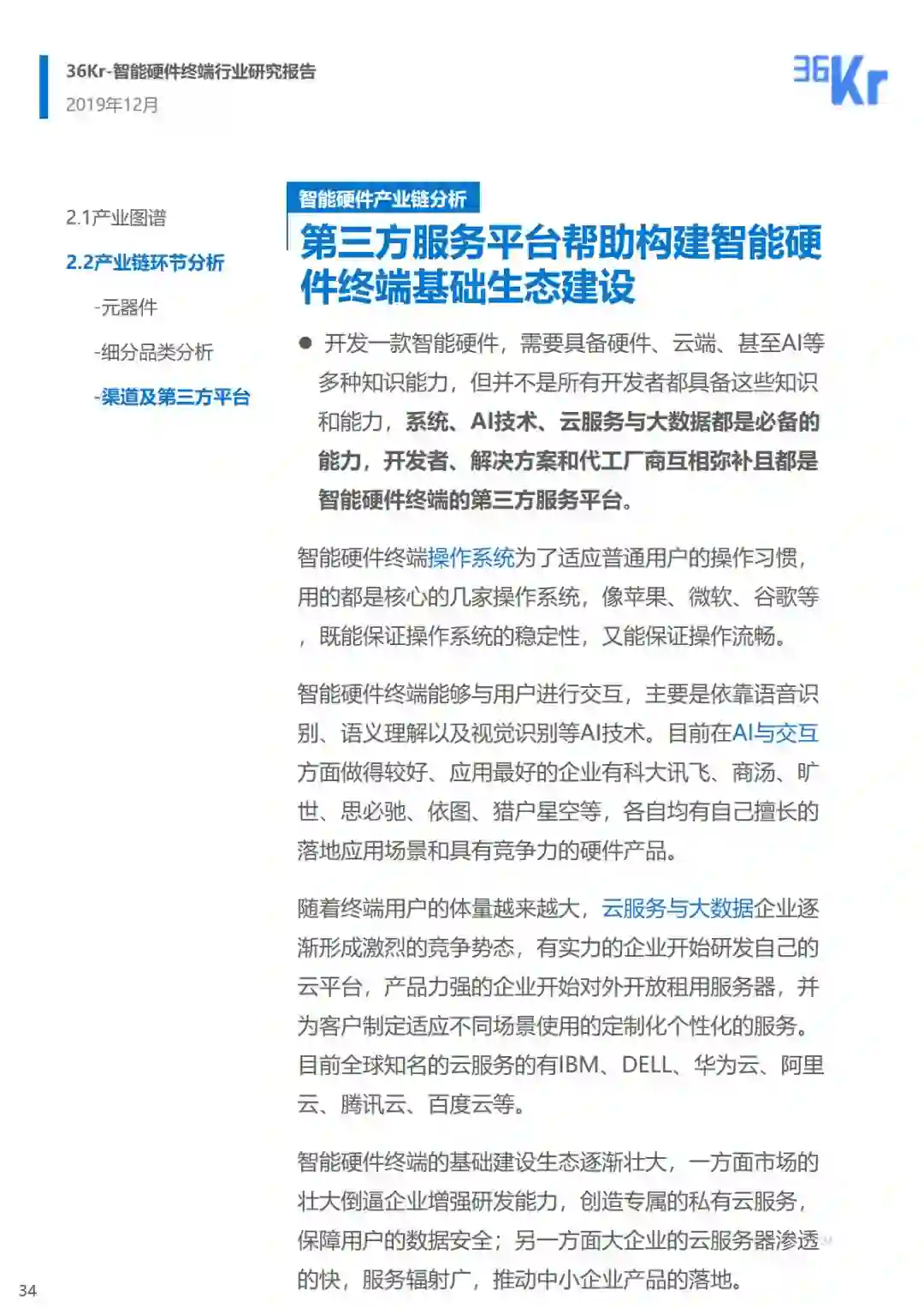 初创型的智能硬件终端企业逐渐壮大,资本市场出现一些新的上市公司,像科大讯飞、京东方、智米科技、华米科技等,这些企业既包含了技术研发又有丰富的智能硬件终端产品体系,还有部分企业背靠互联网基因的母公司,培养了良好的用户生态,比如猎户星空、小米生态链企业。