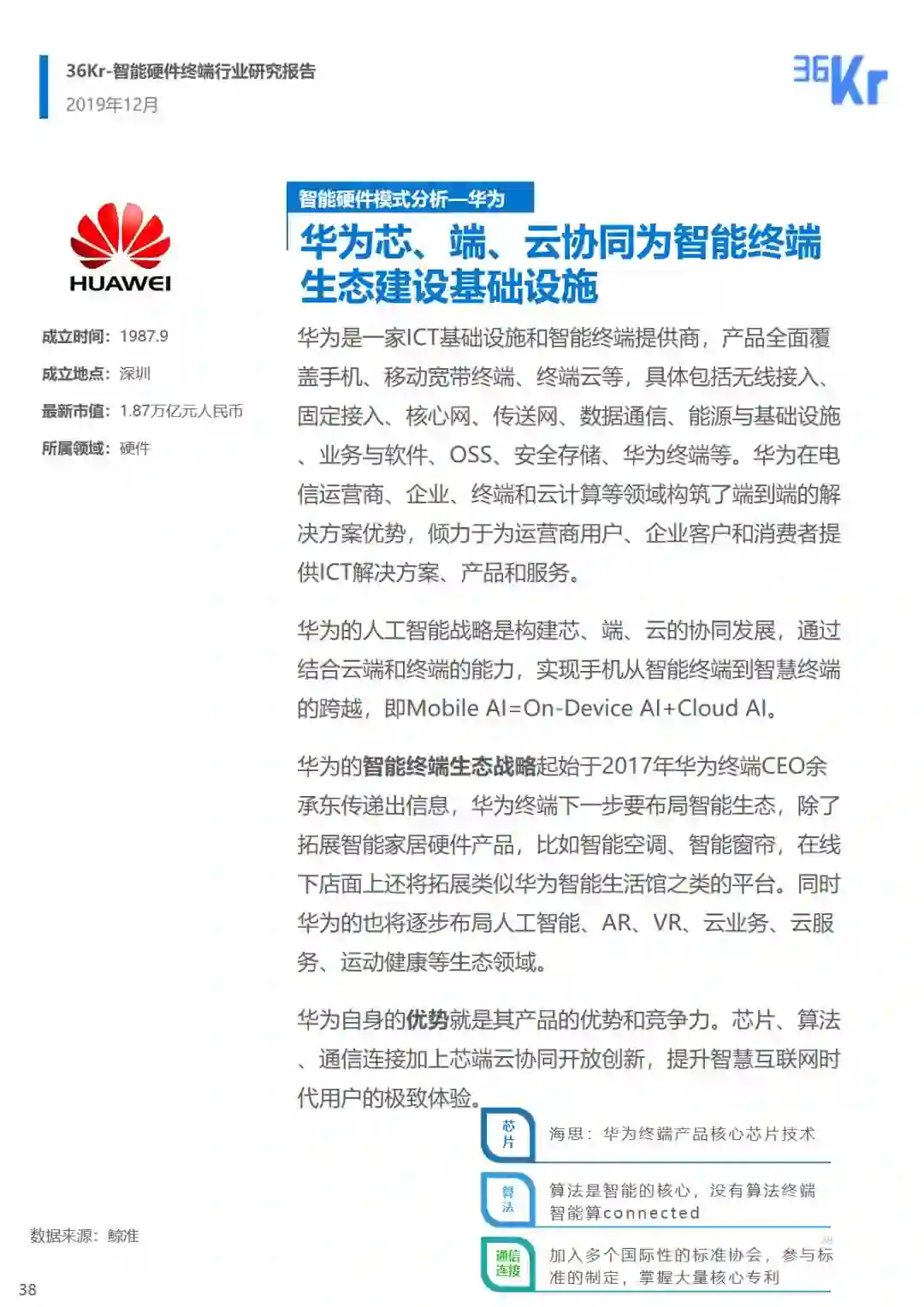 2019年我国智能硬件终端行业进入高速发展阶段,以小米、华为为代表的行业大厂凭借自身软件开发能力、用户基数以及完善的产业链多重优势,其各自运营的生态大局已初具规模,以小米MIUI系统和华为手机为控制核心的智能硬件终端产品线规模扩展迅速。