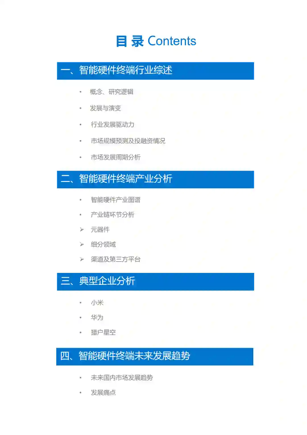 智能硬件终端的领域包含的范围甚广,现阶段智能家居设备、智能机器人、智能车载设备、智能医疗设备、智能可穿戴设备、智能大屏设备、智能安防设备等细分场景领域都有较好的落地和应用,每个领域的产品品类都很丰富。
