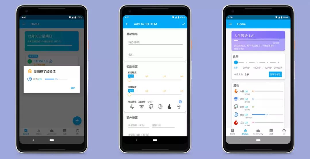 人升采用了时下流行的圆角卡片设计,界面和动效设计都十分用心,使用人升建立待办事项的过程时,我们可以为每个事件设置独立的难度系数、紧急程度和属性加成,比如为运动相关的事件分配「力量」属性值奖励、为学习相关的事件分配「学识」属性值奖励、为社会交际相关的事件分配「魅力」属性值奖励等等。在提升效率、搞定任务的同时,我们也能不断提升自己的各方面「属性」,达到「升级」目标,还是颇有成就感的。