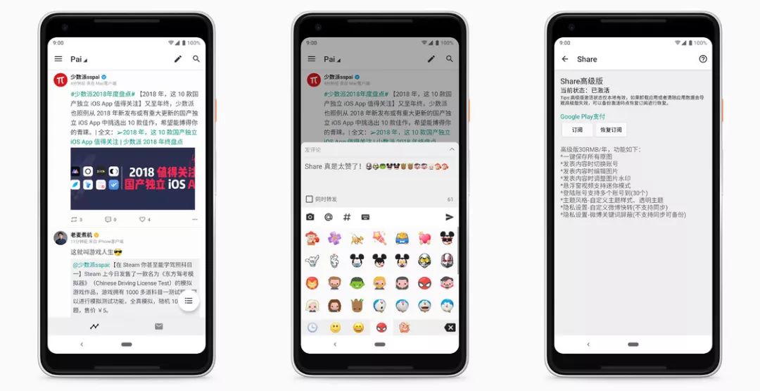 但最重要的一点在于,在健康的付费模式支持下,Share 在过去这一年里一直保持着较高的更新频率,不断完善微博浏览功能和浏览体验的同时,一些微博官方客户端中的新东西(如圣诞老人、复联等热门表情)Share 几乎也都能在第一时间进行跟进——付费制度似乎在某种程度上支撑起了这款第三方微博客户端的不断更新和迭代,加入高级功能订阅后的 Share 找到了更加健康的生存模式,走得也是越来越好。
