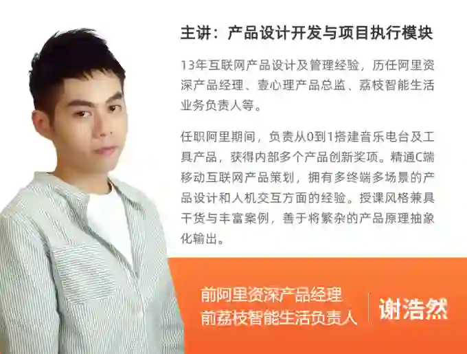 本次授课老师为 前阿里资深产品经理@谢浩然老师 13年互联网产品设计及管理经验,历任阿里资深产品经理、壹心理产品总监、荔枝智能生活业务负责人等。