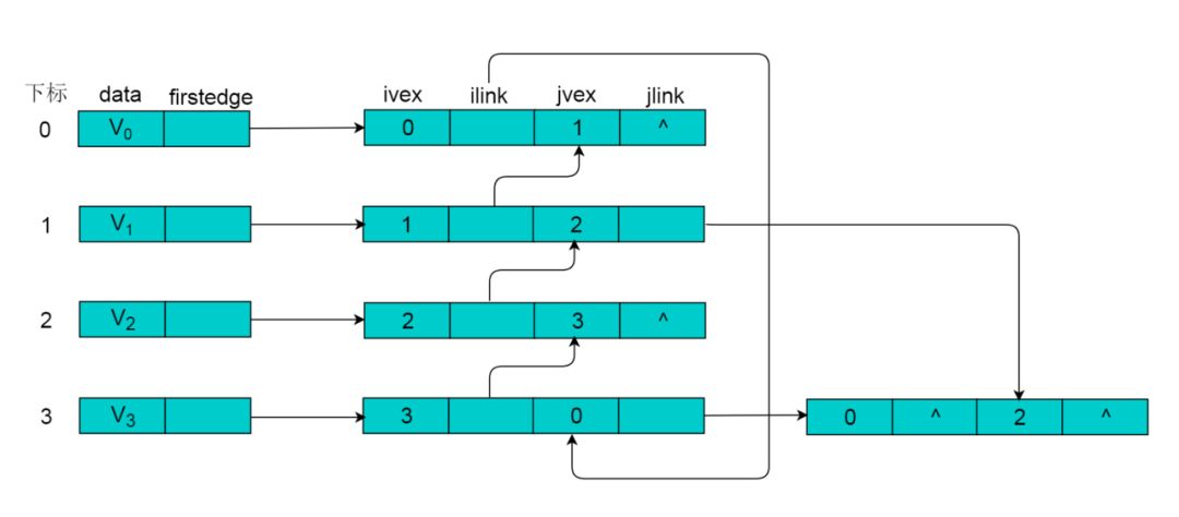对于无向图而言,其每条边在邻接链表中都需要两个结点来表示,而邻接多重表正是对其进行优化,让同一条边只用一个结点表示即可。邻接多重表仿照了十字链表的思想,对邻接链表的边表结点进行了改进。