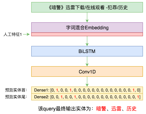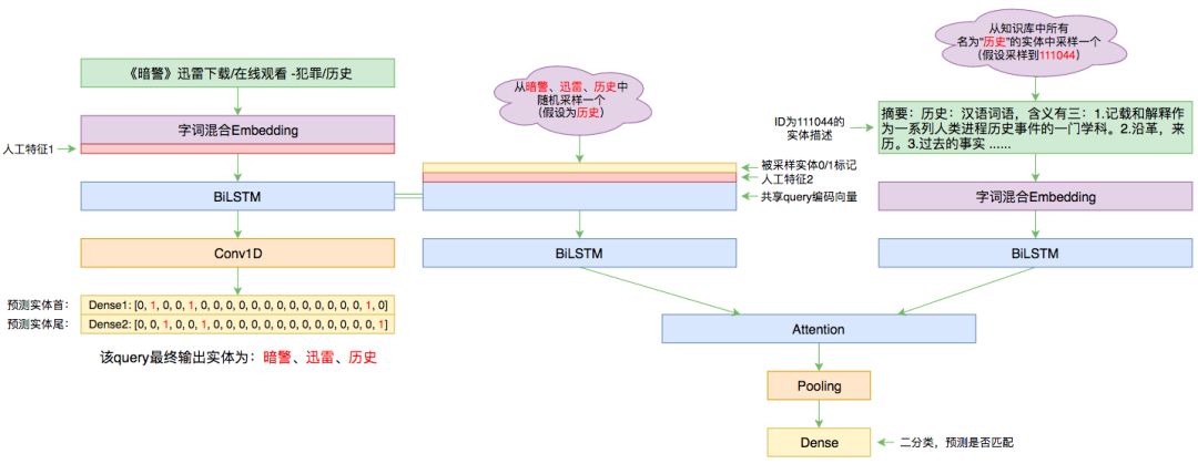 比如,前面示意图中的 query“《暗警》迅雷下载/在线观看 -犯罪/历史”只标注出了“暗警”、“迅雷”、“历史”三个实体,事实上“下载”、“在线”、“观看”、“犯罪”都是知识库里边的实体,而且存在能够适配这个 query 的实体 id。